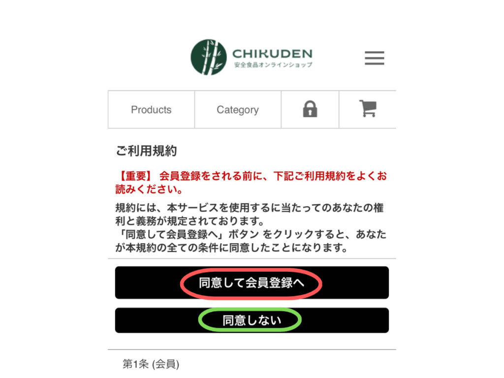 リンクを開くと利用規約の画面が表示されます。「同意しない」を選んでも商品を見ることができます。